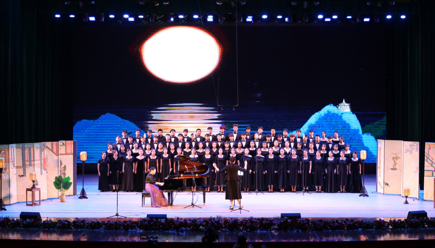 演出在我校音乐学院合唱团演绎的《次北固山下》中拉开帷幕。余惠承教授师生团队为观众们带来了《白头吟》《画》《声声慢》《蝶恋花·槛菊愁烟兰泣露》《锦瑟》《决别书》等经典古诗词艺术歌曲。其中,余惠承教授的两首独唱《白头吟》《画》技惊四座:《白头吟》通过声音的抑扬顿挫,传达了歌词中的情感波动,使听众能够深刻感受到歌曲中的悲愤与渴望;《画》又使现场观众仿佛置身于一幅宁静而美好的山水画卷。