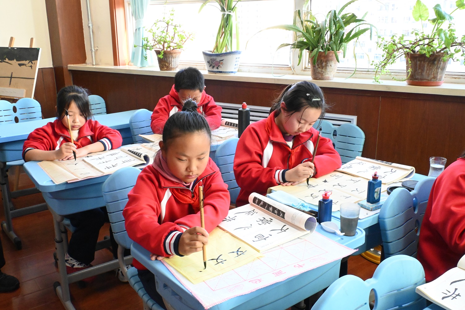 随后,师生们深入经开区实验小学书法大课堂进行交流学习。在美术学院书法系主任胡武和教师李培根的指导示范下,学生们学习了书法的基本知识和技巧。孩子们兴致勃勃地拿起毛笔,在宣纸上认真地书写着每一个汉字,细心感受中华优秀传统文化的魅力。