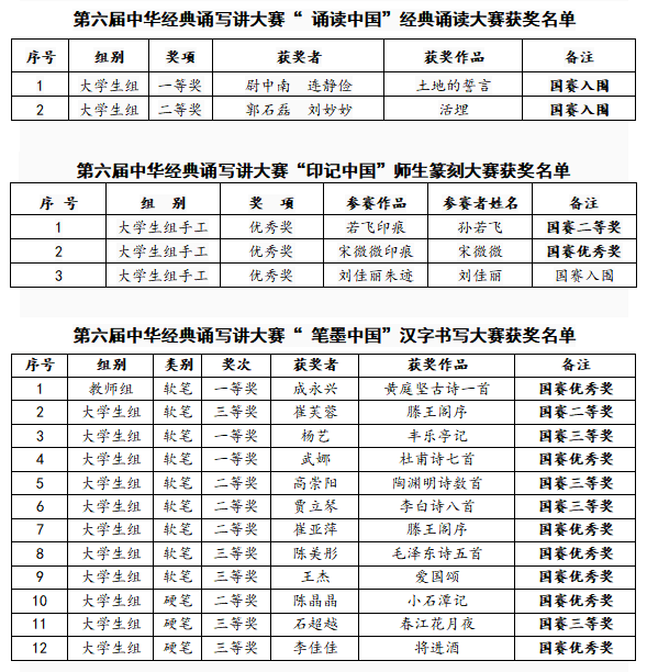 近日,山西省教育厅公布了第六届中华经典诵写讲大赛山西赛区获奖名单,我校共有64件作品获奖,其中一等奖3个、二等奖11个、三等奖10个、优秀奖40个,王子懿、胡松洋2位教师荣获“优秀指导教师”称号。华体育·登录入口(官方)网站荣获集体优秀组织奖,教务部、文学院、美术学院和李碧琛、李润民、李培根获优秀组织奖。