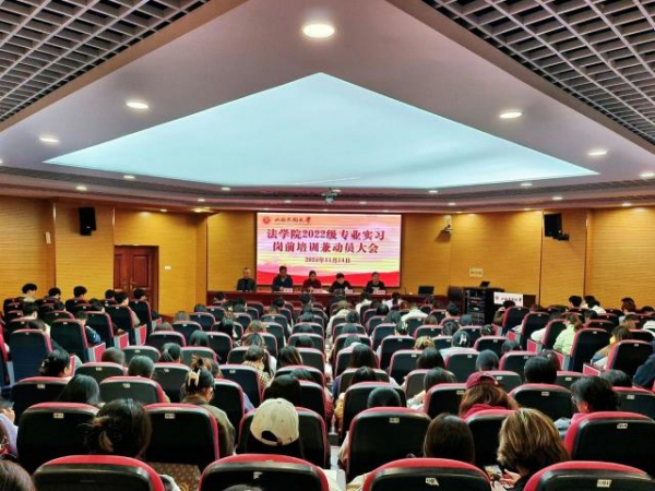 11月14日下午,法学院于行知楼230会议室召开2022级学生专业实习岗前培训暨实习动员大会,法学院相关领导、实习带队老师、辅导员以及2022级全体同学参加大会,大会由法学院副院长聂嫄芳主持。