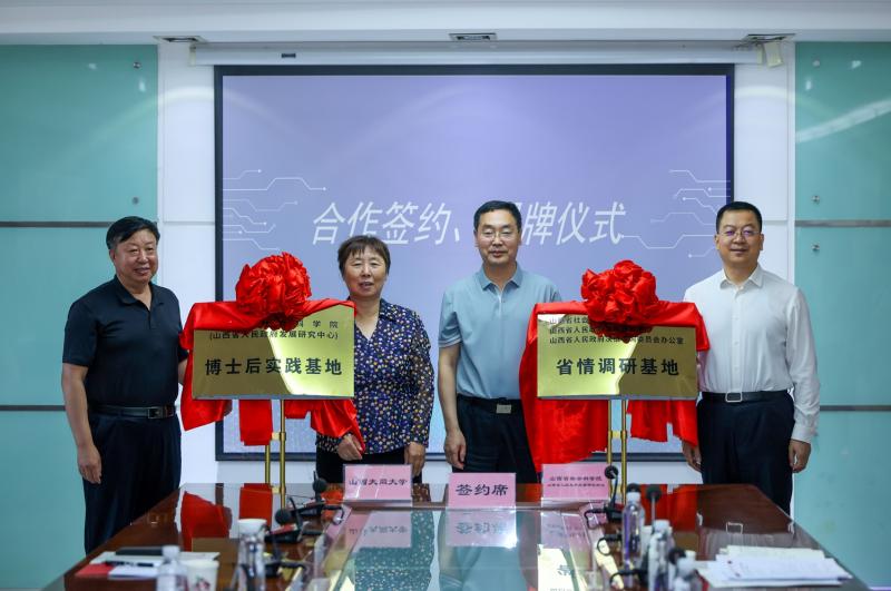 双方领导共同为“山西省人民政府决策咨询委员会省情调研基地”和“博士后科研工作站实践基地”揭牌。